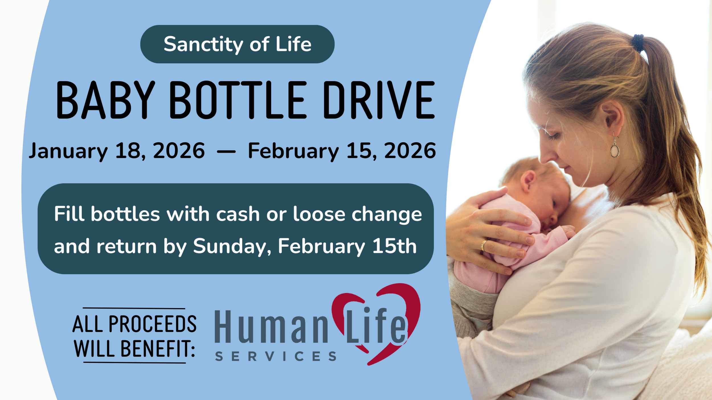 The annual Baby Bottle Campaign to benefit Human Life Services begins on January 18th, Sanctity of Life Sunday. Pick up a baby bottle at the Outreach post in the atrium, drop your cash, checks or coins in the bottles and return them back to the Outreach post by February 15th.