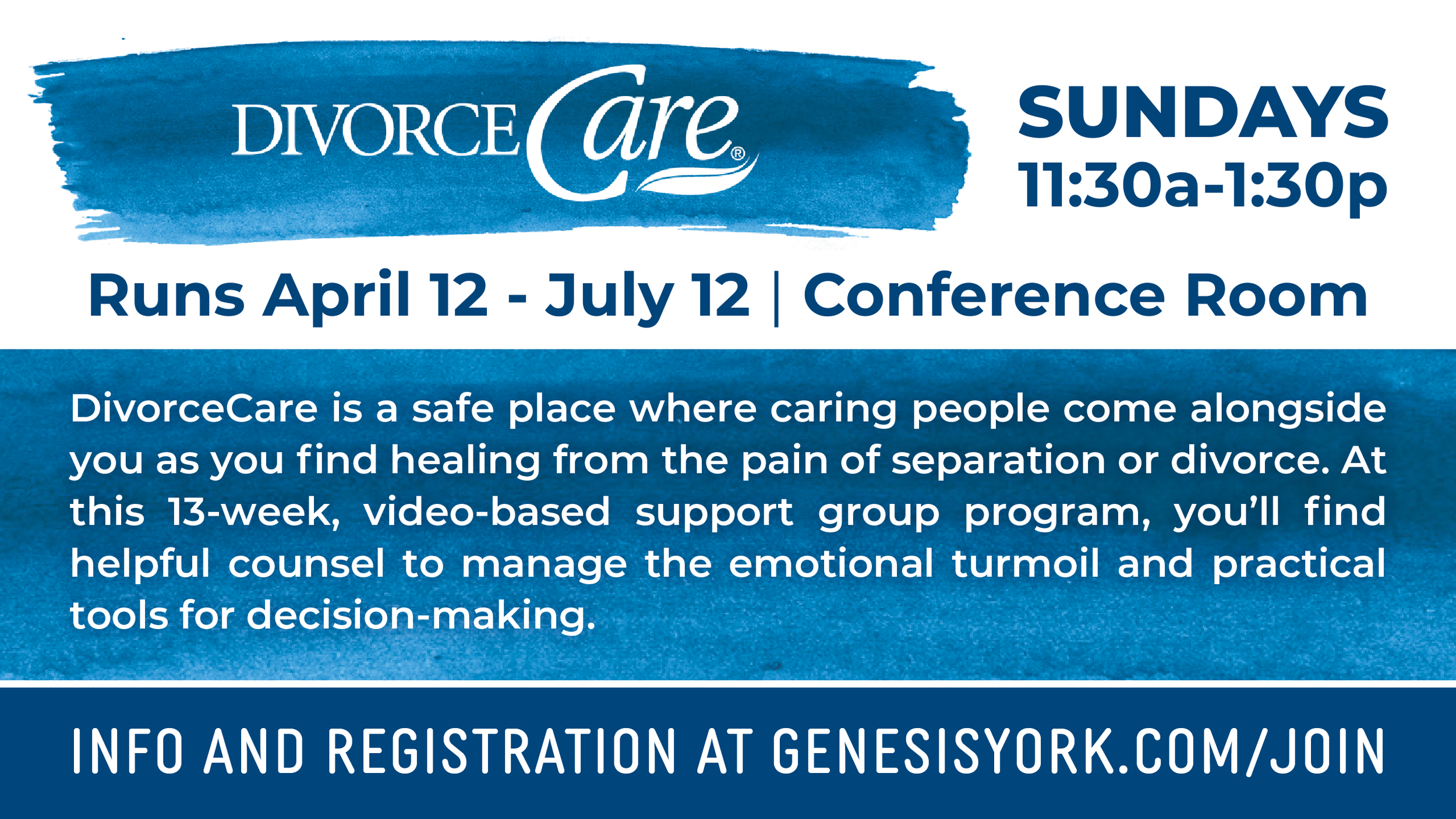 DivorceCare is a safe place where caring people come alongside you as you find healing from the pain of separation or divorce. At this 13-week, video-based support group program, you’ll find helpful counsel to manage the emotional turmoil and practical tools for decision-making.