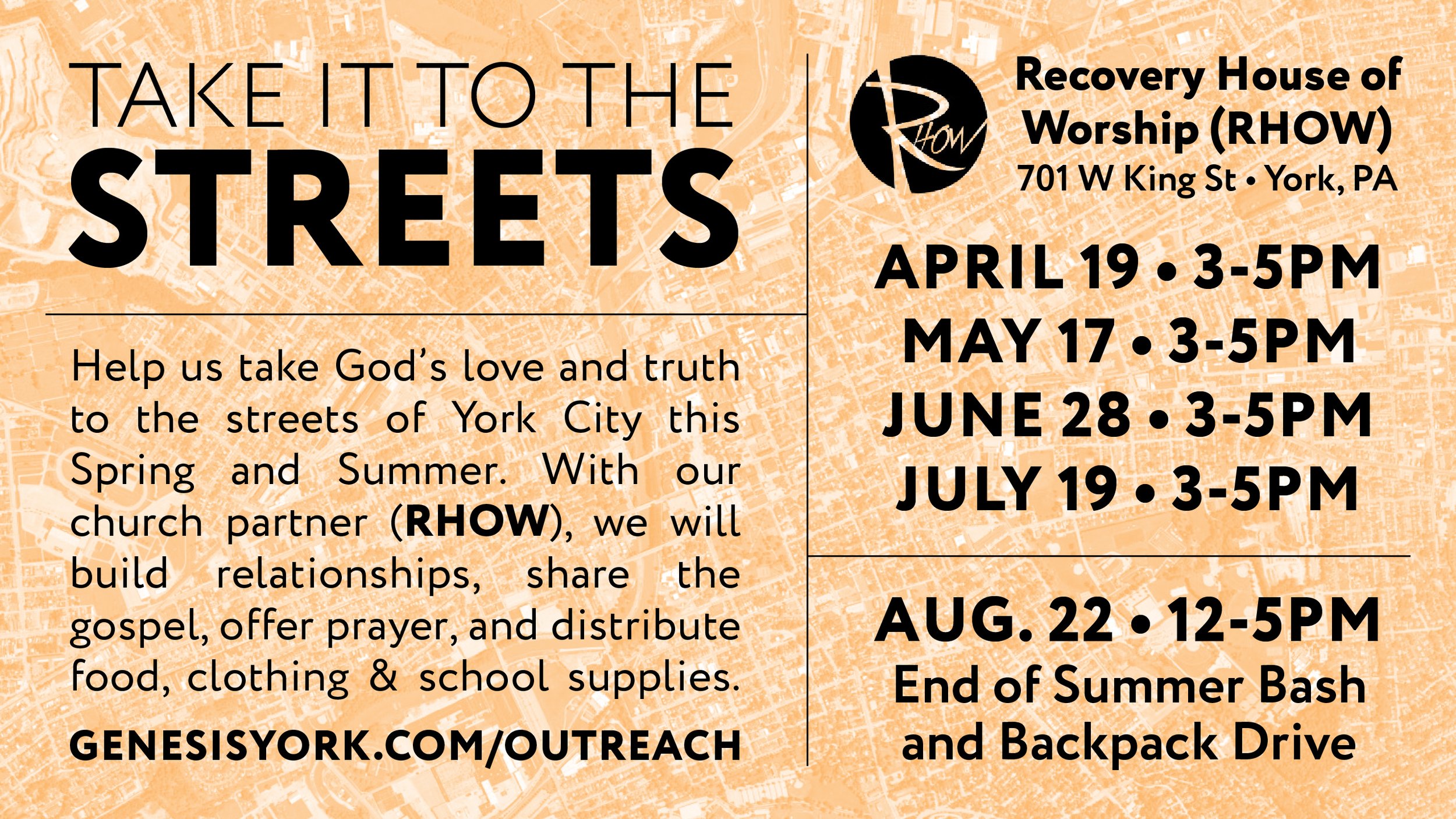 Taking it to the Streets is a small piece of our outreach, local missions. Help us take God’s love and truth to the streets of York City this Spring and Summer. With our church partner (Recovery House of Worship), we will build relationships, share the gospel, offer prayer, and distribute food, clothing & school supplies.